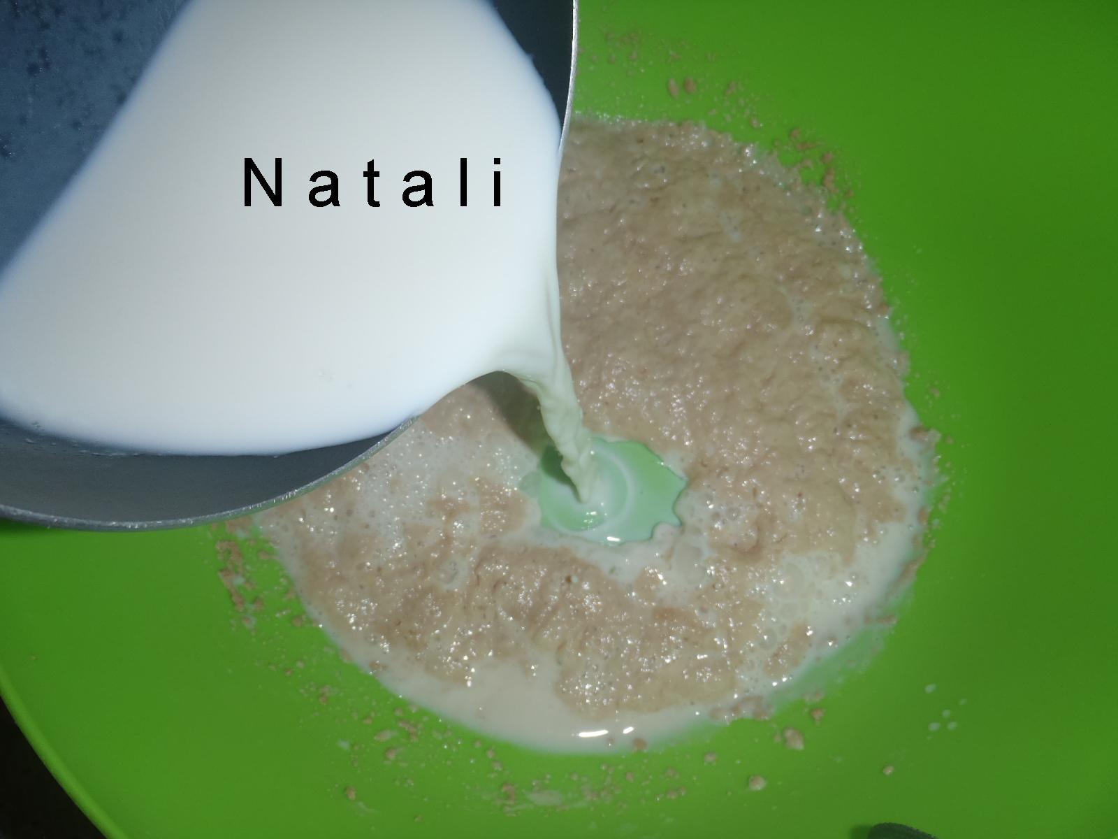 залить теплым молоком.Хорошо перемешать и оставить на 15 минут в теплое место.